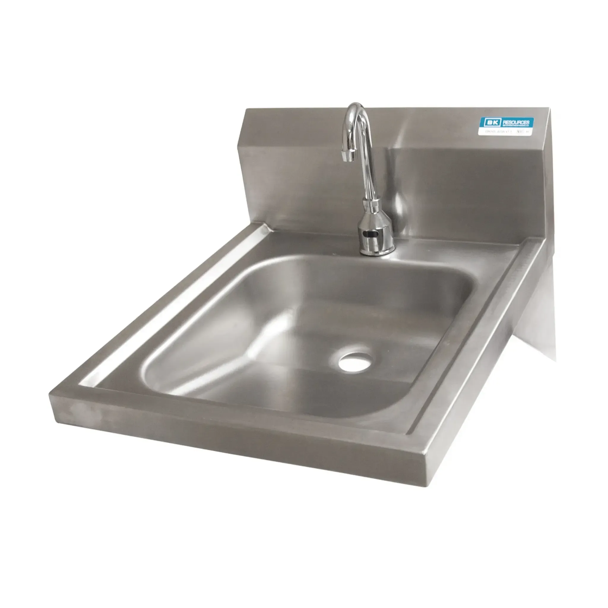 Elevate your dining experience with the BK Resources BKHS-ADA-D-1-P-G Hand Sink. This wall-mounted sink is designed specifically for commercial restaurant use, ensuring durability and functionality. The 14"W x 16"D x 5" deep bowl provides ample space for handwashing, while the 1-7/8" drain opening allows for efficient water drainage. The sink comes complete with a BKF-DEF-3G electronic sensor faucet, a 4" OC solid body deck mount faucet, and a 3-1/2" gooseneck spout with wrist blade handles, offering convenience and ease of use. The 8" riser and 1" turn down on the rear riser provide added support and stability. Made of 18/304 stainless steel, this sink is not only ADA compliant but also NSF certified, ensuring the highest standards of hygiene and safety. With its sleek design and practical features, the BK Resources BKHS-ADA-D-1-P-G Hand Sink is the perfect addition to any commercial restaurant.