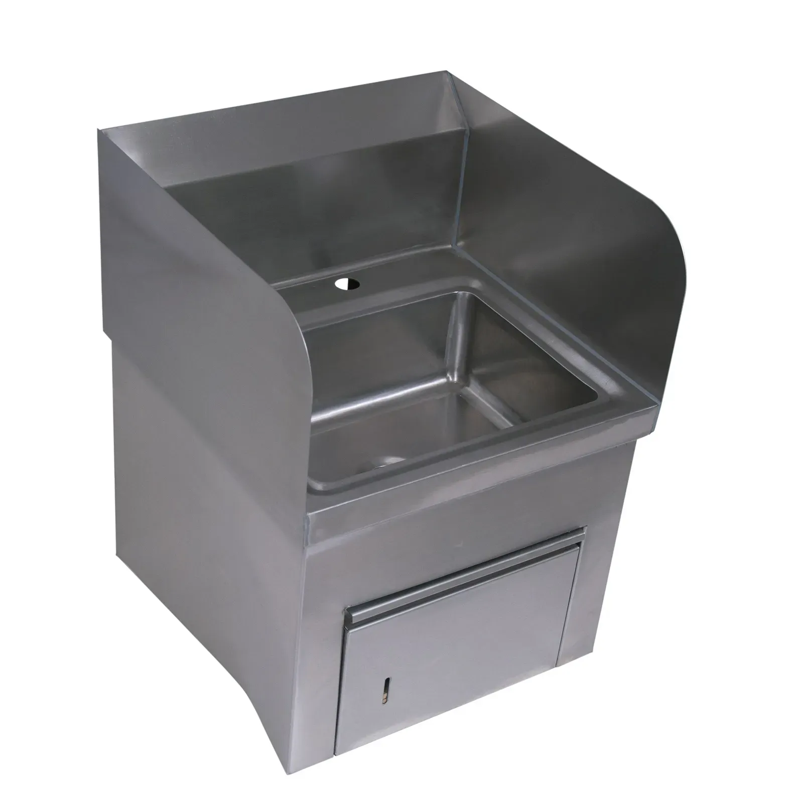 Cook with confidence and flair using the BK Resources BKHS-D-1410-SKTS Hand Sink. This wall-mounted hand sink is designed specifically for commercial restaurant use, ensuring durability and functionality. The sink features a 14" wide x 10" front-to-back x 5" deep bowl, providing ample space for handwashing. With 4" OC deck mount faucet holes, you can easily install a faucet of your choice. The integrated towel dispenser on the front allows for convenient access to hand towels, promoting hygiene in the kitchen. The side splashes on the left and right prevent water from splashing onto surrounding surfaces, keeping your workspace clean and dry. Made of 304 stainless steel, this hand sink is built to withstand the demands of a busy restaurant environment. It also includes a basket drain (BKDR-2) and wall mounting hardware for easy installation. Trust BK Resources for high-quality, NSF-certified restaurant equipment.