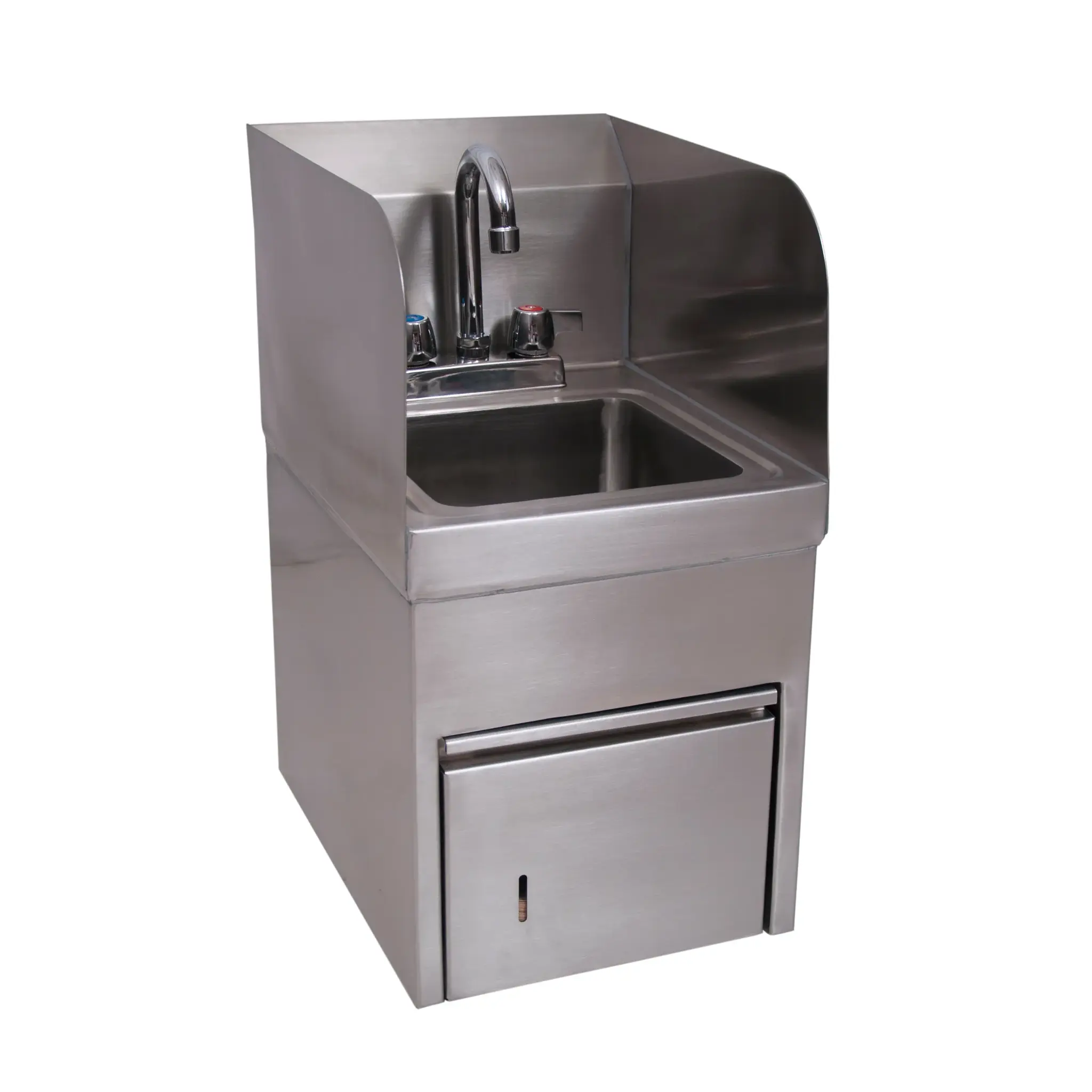 Equip your commercial kitchen with the BK Resources BKHS-D-SS-SKTS-P-G Hand Sink. This wall-mounted sink is designed to meet the needs of a busy restaurant environment. The sink features a 9" wide x 9" front-to-back x 5" deep bowl, providing ample space for handwashing. It also includes a 4" OC deck mount faucet for easy access to water. The integrated towel dispenser on the front of the sink ensures that hand drying is convenient and hygienic. With side splashes on the left and right, as well as an 8" high backsplash, this sink helps to contain water and prevent messes. The sink is constructed from durable 304 stainless steel, ensuring its longevity and resistance to corrosion. It is NSF certified, guaranteeing its compliance with health and safety standards. Upgrade your kitchen with the BK Resources BKHS-D-SS-SKTS-P-G Hand Sink and enjoy its convenience and durability.