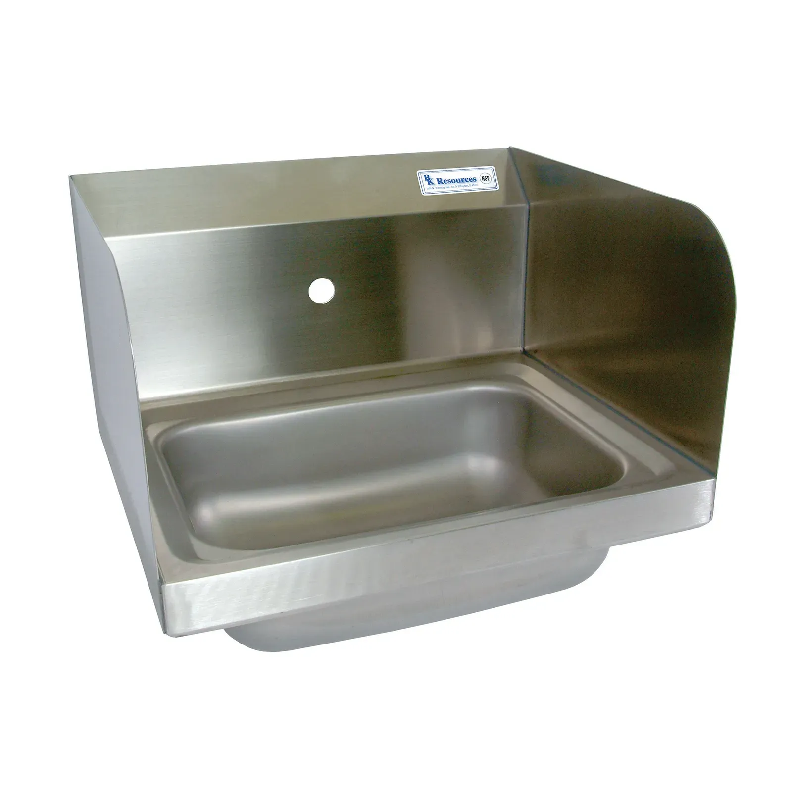 Cook with confidence and flair using the BK Resources, BKHS-W-1410-1-SS Hand Sink. This wall-mounted sink is designed specifically for commercial restaurant use, ensuring durability and functionality. The sink features a 14" wide x 10" front-to-back x 5" deep bowl, providing ample space for handwashing and other tasks. With a single splash mount faucet hole and side splashes on the left and right, this sink helps to contain water and prevent messes. The 8-1/8" backsplash adds an extra layer of protection, keeping your walls clean and hygienic. Made from 304 stainless steel, this sink is built to withstand the demands of a busy kitchen and is NSF certified for food safety. The BKHS-W-1410-1-SS Hand Sink also includes a basket drain and wall mounting hardware, making installation a breeze. Upgrade your restaurant's handwashing station with this reliable and efficient hand sink from BK Resources.