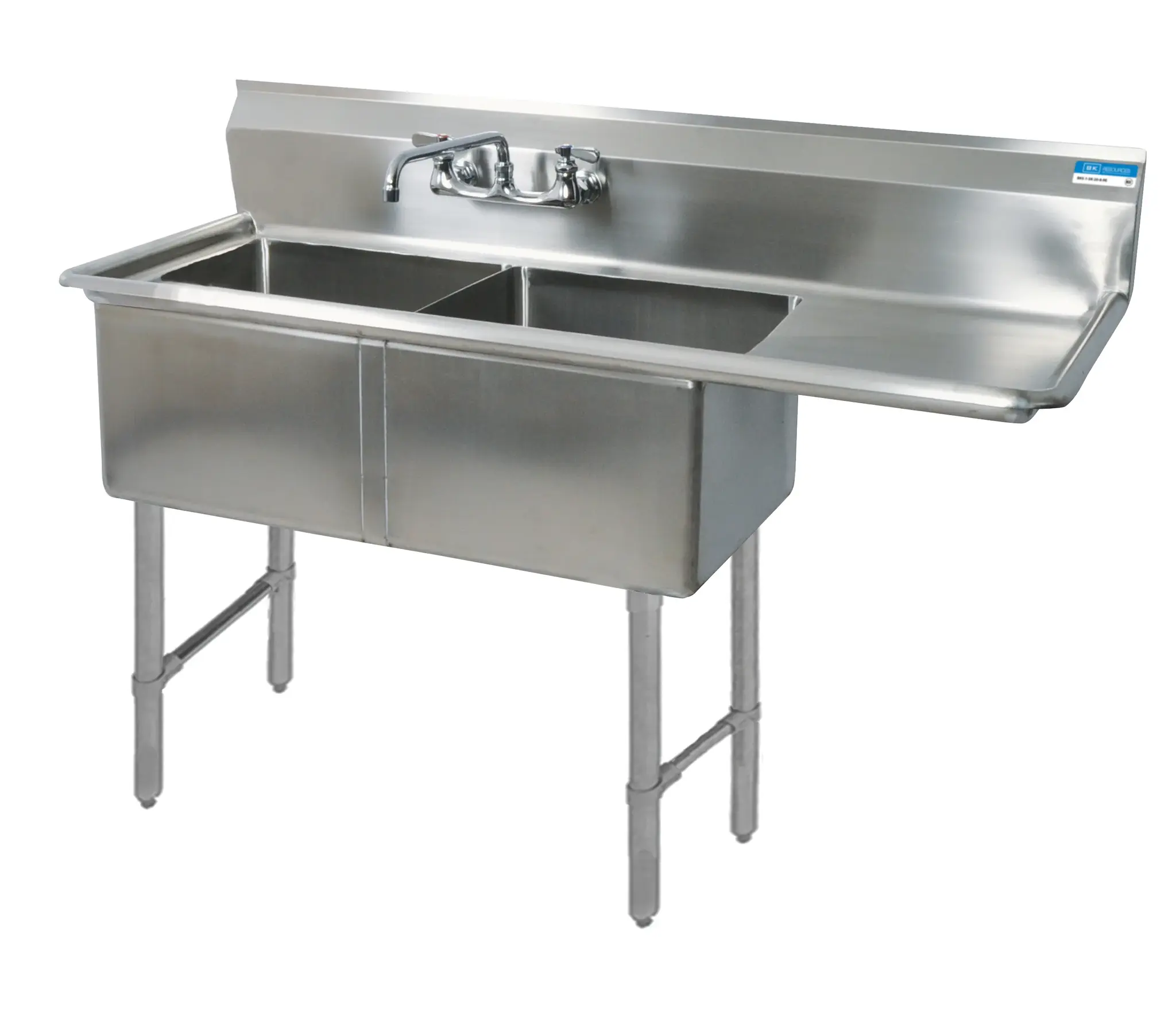 Empower your kitchen staff with the BK Resources, BKS6-2-18-14-18RS Sink. This two-compartment sink is designed to meet the demands of a busy commercial restaurant. With its 18" wide x 18" front-to-back x 14" deep compartments, it provides ample space for washing and rinsing dishes. The 18" drainboard on the right side allows for convenient drying and stacking of clean dishes. The sink also features a 10" backsplash and 8 OC splash mount faucet holes, ensuring a clean and sanitary workspace. Made of 16/304 stainless steel, the deck and bowls are durable and resistant to corrosion. The stainless steel legs and side bracing provide stability, while the adjustable stainless steel over plastic bullet feet allow for easy leveling. This NSF-certified sink includes basket drains, making it a reliable and efficient addition to any commercial kitchen. Upgrade your restaurant's efficiency and cleanliness with the BK Resources, BKS6-2-18-14-18RS Sink.