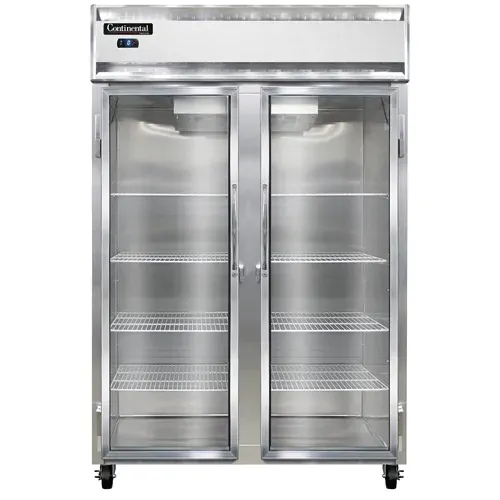 Introducing the Continental Refrigerator, 2FNGD, Freezer, Reach-In - the perfect solution to simplify restaurant operations. This two-section, self-contained freezer is designed to meet the demanding needs of a commercial restaurant. With its aluminum exterior and interior, along with a stainless steel front, this freezer is built to withstand the rigors of a busy kitchen. The narrow hinged glass door allows for easy visibility and access to the contents inside. The electronic control with a digital display ensures precise temperature management, while the hi-low alarm alerts staff of any fluctuations. The 1 HP electric condensate evaporator helps maintain optimal performance and efficiency. Made in the USA and certified by cETLus and NSF, this Continental Refrigerator is a reliable and durable choice for any restaurant. Simplify your operations with the Continental Refrigerator, 2FNGD, Freezer, Reach-In.