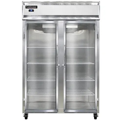 Master the art of flavor with the Continental Refrigerator, 2RNGD, Refrigerator, Reach-In. This two-section reach-in display refrigerator is designed to meet the needs of commercial restaurants. With its aluminum exterior and interior, stainless steel front, and narrow hinged glass doors, this refrigerator not only looks sleek but also provides durability and easy visibility of the stored items. The electronic control with a digital display allows for precise temperature management, ensuring that your ingredients stay fresh and at the optimal temperature. The hi-low alarm alerts you if the temperature deviates from the set range, preventing any potential spoilage. The electric condensate evaporator eliminates the need for manual defrosting, saving you time and effort. With a 1/2 HP compressor, this refrigerator delivers powerful cooling performance. Made in the USA and certified by cETLus and NSF, you can trust the quality and reliability of this Continental Refrigerator. Upgrade your restaurant's refrigeration system with the 2RNGD and experience enhanced efficiency and convenience.