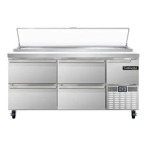 Enhance the heart of your restaurant with the Continental Refrigerator, PA68N-D, Refrigerated Counter, Pizza Prep Table. This two-section table is designed to meet the demands of a busy commercial kitchen. With a 68" width and a 22.0 cu ft capacity, it provides ample space for all your pizza preparation needs. The 300 series stainless steel worktop is not only durable but also features a 19" poly cutting board for convenient food preparation. The table is equipped with four drawers that can hold two 12 x 20 x 6 pans each (pans supplied by others), allowing for efficient organization and easy access to ingredients. The electric condensate evaporator ensures hassle-free maintenance, while the stainless steel front and end panels add a sleek and professional look to your kitchen. With its side-mounted refrigeration and 1/2 HP motor, this pizza prep table delivers reliable cooling performance. Made in the USA and certified by cETLus and NSF, you can trust the quality and safety of this Continental Refrigerator product. Upgrade your restaurant's pizza preparation station with the Continental Refrigerator, PA68N-D, Refrigerated Counter, Pizza Prep Table.