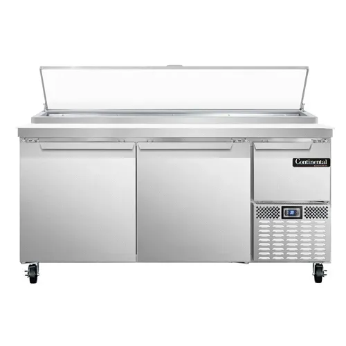 Streamline your restaurant cooking operations with the Continental Refrigerator, PA68N Refrigerated Counter, Pizza Prep Table. This two-section table is designed to optimize efficiency in your commercial kitchen. With a spacious 68"W and a generous 22.0 cu ft capacity, it provides ample storage for all your ingredients. The forced air system ensures consistent cooling throughout, keeping your pizzas fresh and ready to serve. The 300 series stainless steel worktop is not only durable but also features a 19" poly cutting board for convenient food preparation. The three field rehingeable doors allow for easy access and flexibility in arranging your supplies. The electric condensate evaporator eliminates the need for manual defrosting, saving you time and effort. The stainless steel front and end panels, along with the aluminum interior, ensure durability and easy cleaning. Equipped with an electronic controller and digital display, you can easily monitor and adjust the temperature to meet your specific needs. The side-mounted refrigeration and 1/2 HP compressor provide efficient cooling while minimizing noise. Made in the USA and certified by cETLus and NSF, this pizza prep table is a reliable and high-quality addition to any commercial restaurant.