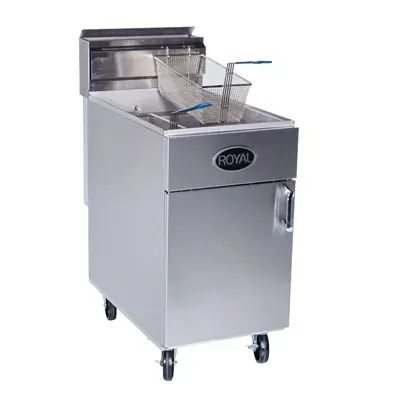 Optimize kitchen functionality with the Royal Range of California, RFT-75 Fryer. This gas floor model fryer is designed for commercial restaurant use, offering a generous 75 lb. oil capacity full tank. With four 38000 BTU burners and thermostatic control, you can easily achieve precise cooking temperatures ranging from 200 to 400 degrees Fahrenheit. The millivolt temperature control ensures consistent performance, while the stainless steel front and sides provide durability and a sleek appearance. The adjustable 6" legs allow for easy customization to fit your kitchen setup. With a powerful 152000 BTU output, this fryer delivers quick and efficient cooking results. It is CSA Star, CSA Flame, and NSF certified, guaranteeing its quality and safety. Made in the USA by Royal Range of California, this fryer is a reliable and authentic choice for any commercial kitchen.